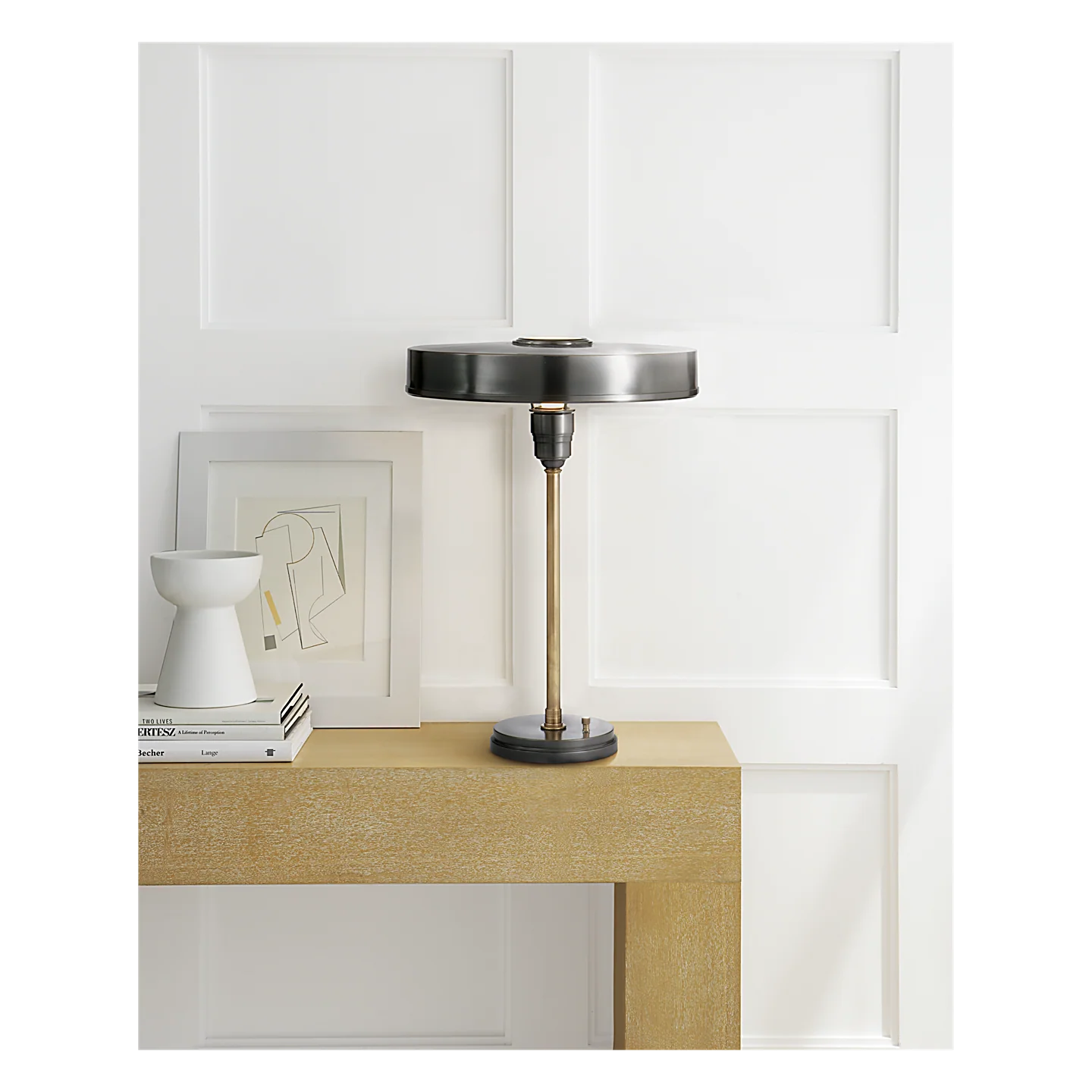 Industrial aesthetic meets sleek silhouettes in Thomas O'Brien's Carlo. Showcasing sophisticated metallic finishes, the table lamp can adapt easily to different styles of d?©cor, whether more industrial or more modern and formal.